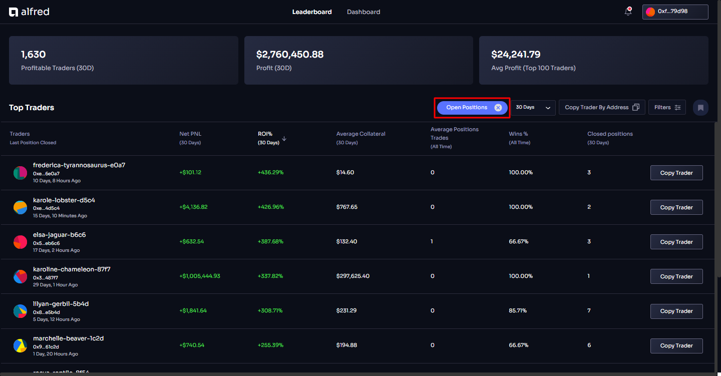 Unlock the power of customization with our filtering feature, allowing users to fine-tune their on-chain trader data based on precise parameters. Tailor your search by criteria like ROI, PnL, win rate, closed positions, collateral, and beyond. It's all about putting you in control. Read more about filters [**here**](https://read.alfred.capital/alfred/quickstart-guide/filters).